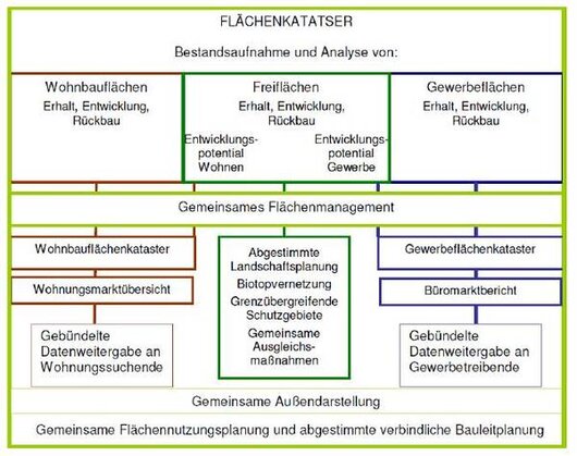 Durch die Daten aus dem Projekt Interkommunales Flächenkataster kommen weitere Freiflächen-Daten, wie bestehende und potentielle Wohnbau- und Gewerbeflächen, hinzu. Dadurch können Bürger, Unternehmen oder Investoren weiträumig nach den für sie am Besten geeignete Fläche schauen. Zudem bietet das Portal Inhalte zu baurechtlichen Fragen und dient als Plattform für verwaltungsinterne Informationsbedürfnisse.